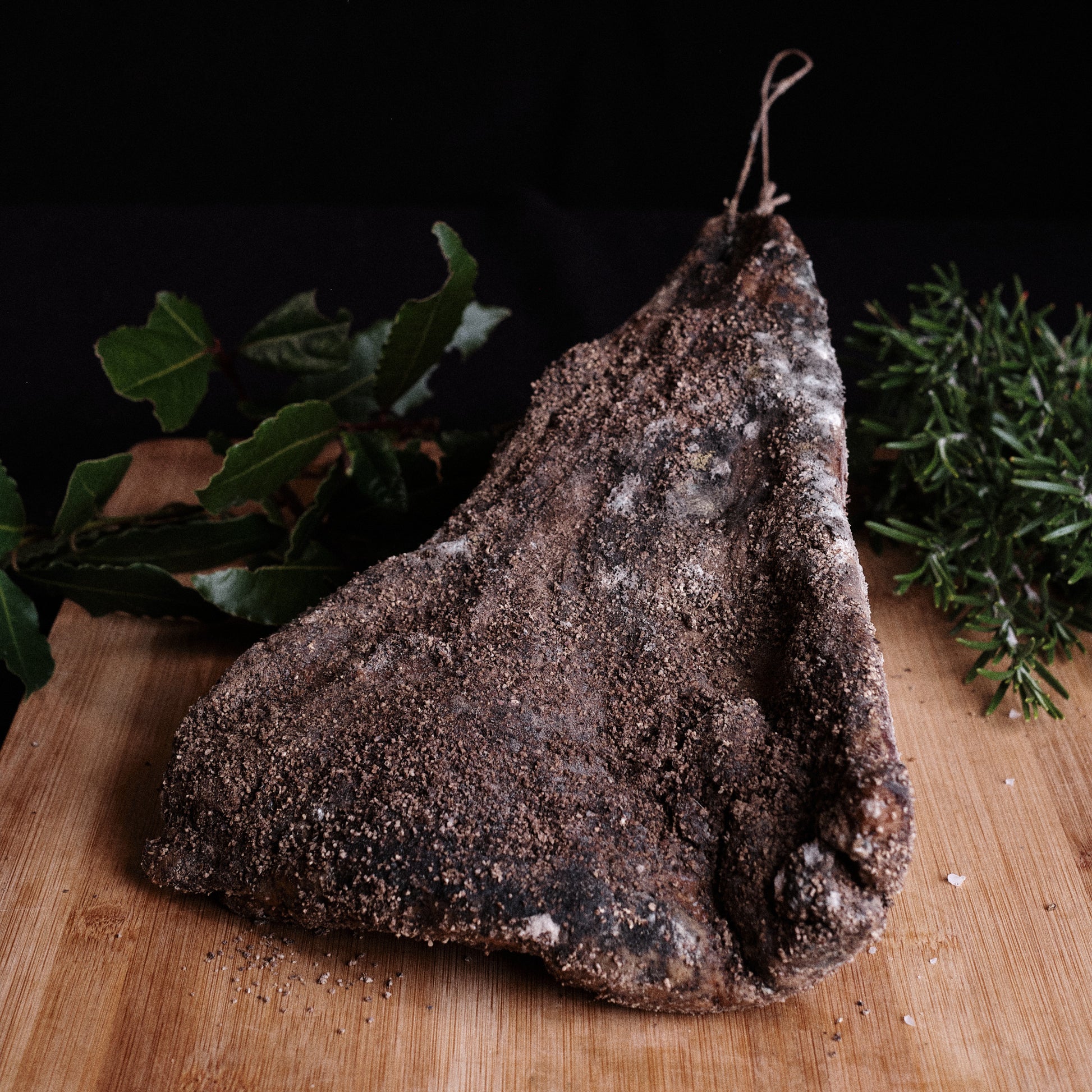 Salato a mano, insaporito con sale, pepe, aglio e vino bianco, viene lasciato stagionare per oltre due mesi in ambienti naturalmente ventilati, per sviluppare un profumo intenso e un sapore deciso ma equilibrato.