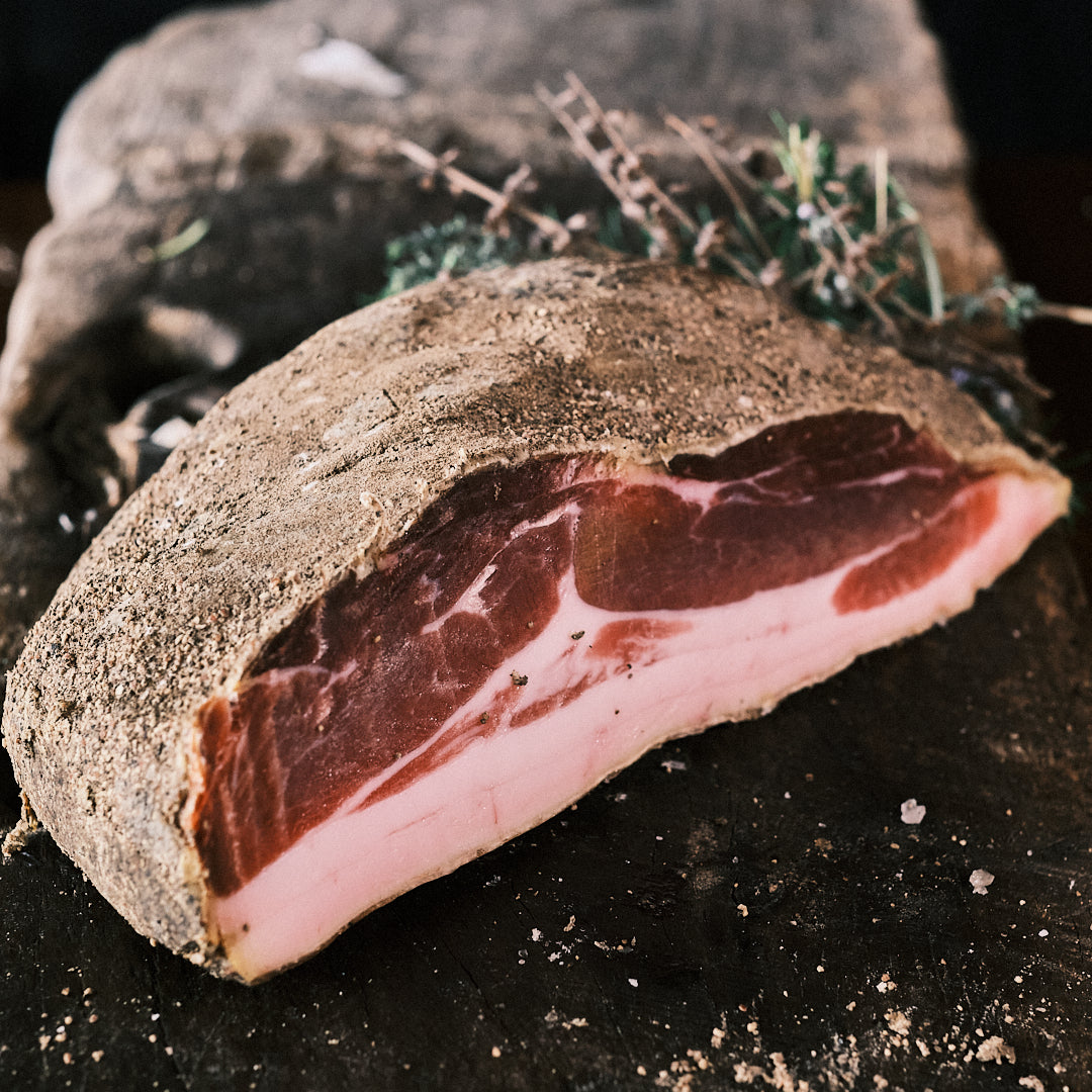 Il nostro Prosciutto di Maiale Nero Disossato è una specialità artigianale unica, frutto di una stagionatura lenta di 18-24 mesi e di una selezione accurata delle migliori razze di maiali allevati allo stato brado.