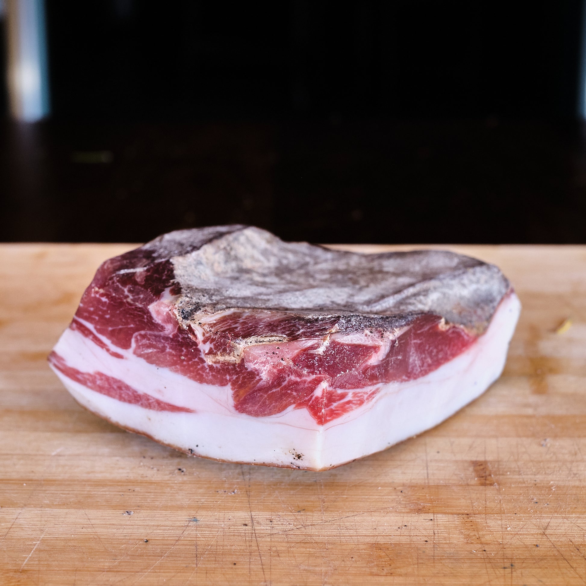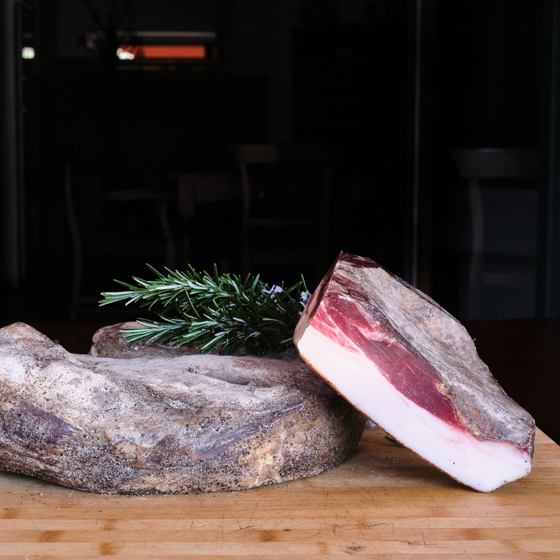Il nostro prosciutto disossato di maiale nero è una specialità umbra unica, ottenuta da suini allevati allo stato brado. Grazie alla stagionatura naturale di 18–24 mesi, sviluppa un gusto intenso, dolce ed elegante, con il perfetto equilibrio tra parte magra e venature di grasso.